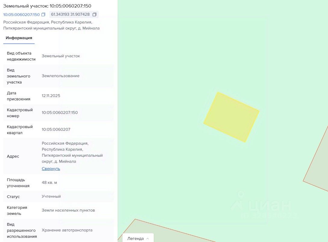 Площадь 48 кв.м, местоположение: Российская Федерация, Республика Карелия, Питкярантский муниципальный округ, д. Мийнала, вид разрешенного использования - Хранение автотранспорта. Территориальная зона - ЖИ. Зона застройки индивидуальными жилыми домами.
