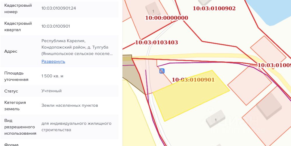 Право заключения договора аренды земельного участка из земель населенных пунктов, имеющего кадастровый номер 10:03:0100901:24, площадью 1500 кв.м, местоположение: Республика Карелия, Кондопожский район, д. Тулгуба (Янишпольское сельское поселение), вид разрешенного использования Для индивидуального жилищного строительства. Территориальная зона Ж-1. Зона застройки индивидуальными жилыми домами.