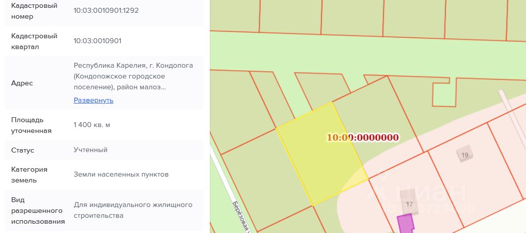 Право заключения договора аренды земельного участка из земель населенных пунктов, имеющего кадастровый номер 10:03:0010901:1292, площадью 1400 кв.м, местоположение: Республика Карелия, г. Кондопога (Кондопожское городское поселение), район малоэтажной застройки, участок 064, вид разрешенного использования Для индивидуального жилищного строительства. Территориальная зона "ЖИ" - зона застройки индивидуальными жилыми домами.