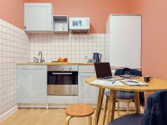 Кухня со всем необходимым (холодильник, варочная панель, духовой шкаф, микроволновая печь, чайник, а так же посуда и приборы)