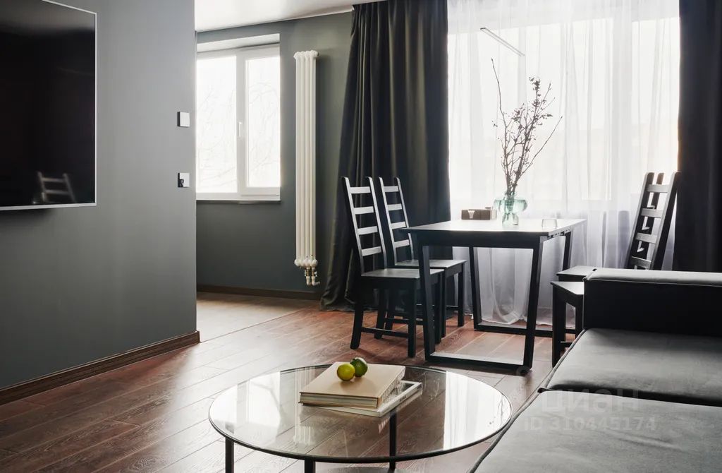 В гостиной раскладной диван и LCD-телевизор с диагональю 75'', а в спальной "парящая" двуспальная кровать 1,6х2 метра.