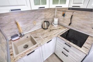 кухонная зона с бытовой техникой, посудой, столовыми принадлежностями, чаем и кофе, сахаром, растительным маслом