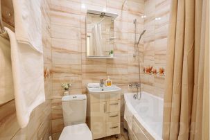 в ванной Вы найдете фен, антибактериальное жидкое мыло, шампунь и гель для душа, предметы гигиены, одноразовые зубные щетки
