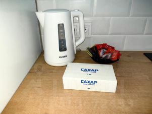 - Полноценная кухня с индукционной варочной поверхностью, холодильником с морозильником, СВЧ-печью, посудомоечной машиной, электрочайником и всей необходимой посудой и кухонной утварью в достаточном количестве.
