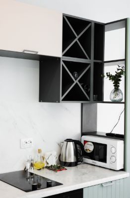 кухонная зона с бытовой техникой (варочная поверхность, духовой шкаф, холодильник,свч-печь, электрочайник) и необходимой посудой