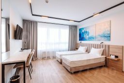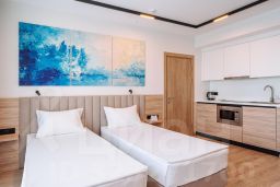 Просторные однокомнатные Апартаменты для гостей, которые ценят удобство и комфорт. В апартаментах есть все для комфортного проживания: полноценная кухня, модульные кровати (твин/дабл), вместительный шкаф, раскладной диван, гладильная доска с утюгом, большая ТВ-панель, кондиционер, бесплатный Wi-Fi, индивидуальный сейф. В ванной комнате - душевая зона, большое зеркало с подсветкой и феном. Для гостей апартаментов подготовлены косметические средства, халаты и тапочки.