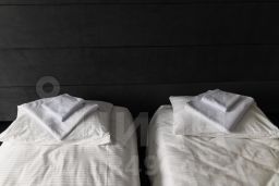 Стильный номер в загородном отеле AINO выполнен в элегантных серых тонах, создавая современную и спокойную атмосферу. Интерьер сочетает минимализм и комфорт, предлагая идеальное пространство для отдыха. Из больших окон открывается вид на живописные природные пейзажи. В номере одна двуспальная или 2 односпальных кровати, шкаф, стол, стулья. Душ, туалет и кухня - общие зоны и находятся на этаже и разделены на мужские и женские.