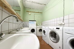 В комнате есть все необходимое: диван, стол, холодильник, стиральная машина, свой кухонный уголок.