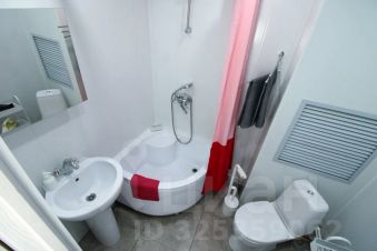 Объединенный санузел. Установлен электрический бойлер для подогрева воды. Есть розетка и фен.