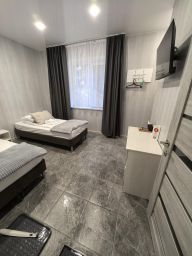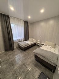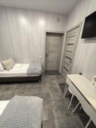 Комната оснащена современной мебелью, телевизором, двумя односпальными кроватями с анатомическими матрасами, которые гарантируют комфортный сон. На каждого гостя предоставляется комплект полотенец. Удобства в комнате : душ, туалет, полотенца, гель для душа, шампунь.