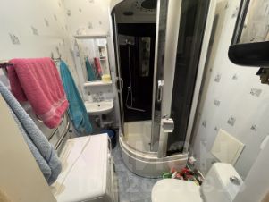 • В спальне куплена новая кровать, так же есть стиральная машина, варочная панель, духовой шкаф, небольшой холодильник, душевая кабина