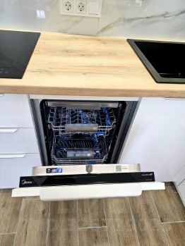Современная кухня со встроенной техникой (варочная панель, посудомоечная машина, микроволновая печь, духовой шкаф, холодильник).