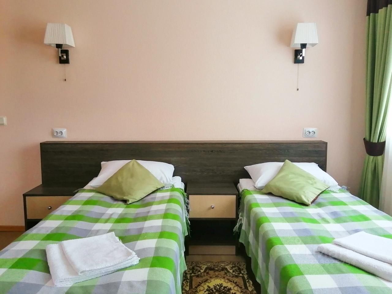 В номере две односпальные кровати ,стол, стулья, шкаф для одежды, ванная комната (душ)
