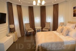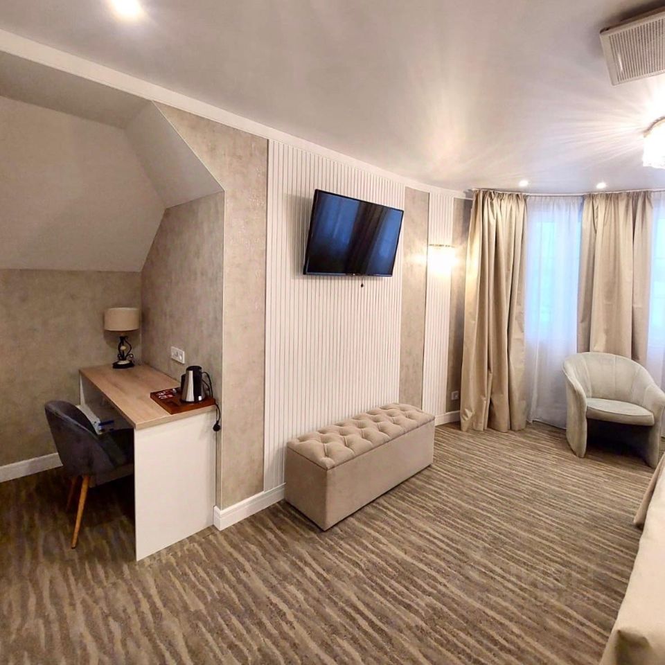 Санузел, душ, большая двуспальная кровать, шкаф, кресла, чемоданница, зона для работы, мини-бар, телевизор, зона для отдыха.