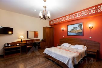 Номера "Полулюкс" это особая гордость отеля "Онежский замок". Неповторимый дизайн интерьеров, картины, светильники, текстиль, всё выполнено руками карельских мастеров. Оформление номеров представлено в характерных для карельской вышивки серо-красных тонах с геометрическими мотивами.