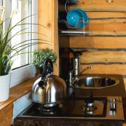 Кухня с газовой плитой, холодильником, микроволновкой, чайником, набором посуды.