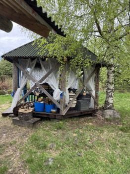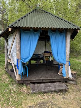 Этот домик стоит у воды .В доме двуспальная кровать на застекленной террасе и места для сна наверху в лoфте. Там можно делать как двуспальное место так и односпальные ,по желанию. Постельное белье прилагается))) Полотенца, шампуни,скрабы включены)) не берите лишнего)) в доме есть вся необходимая мебель,посуда ,салфетки и так далее. К дому прикреплена лодка . В 5 метрах зона барбекю со всем необходимым включая тандыр ,и так далее. есть банный дом. У нас огромный сад .