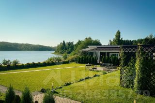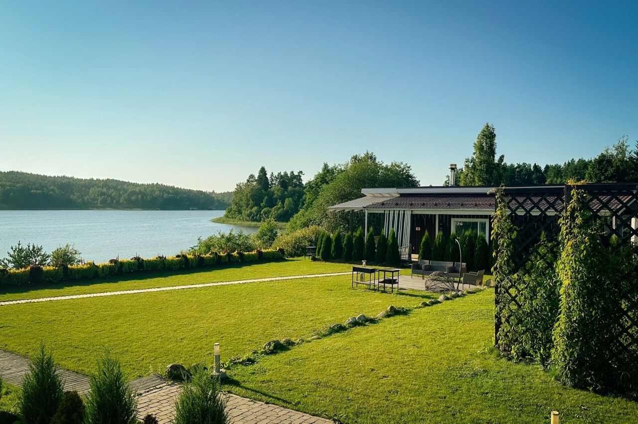 Терраса с уличной мебелью и видом на Ладожское озеро.