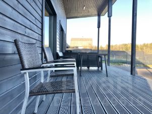 Большая терраса с садовой мебелью - отличное место для семейной трапезы, много места и света, прекрасный вид на лес, зона для мангала, wi-fi, система безопастности, парковка.