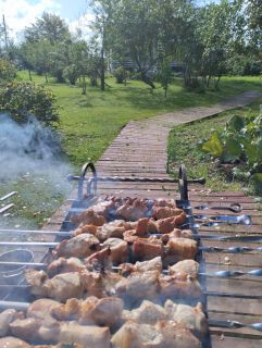 Зона отдыха под крышей со столом и стульями (беседка), мангал и коптильня (решетка и шампура для приготовления предоставляются);