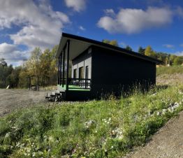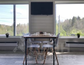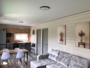 2 уютные спальни, спальное место 160/200. Компактный раскладной диван, большая гостиная совмещенная с кухней, панорамные окна с видом на лес.