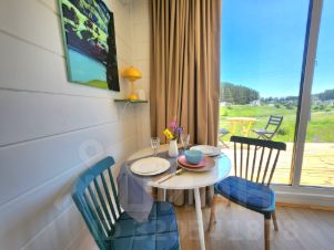 Панорамные окна в пол, просторная терраса с шезлонгами и столиком и стульями для ужина или завтрака на свежем воздухе.