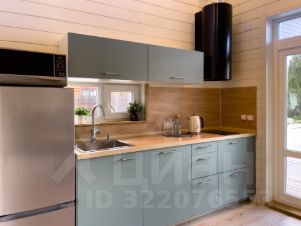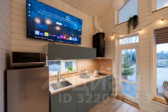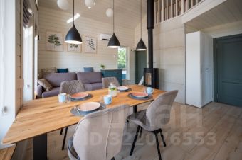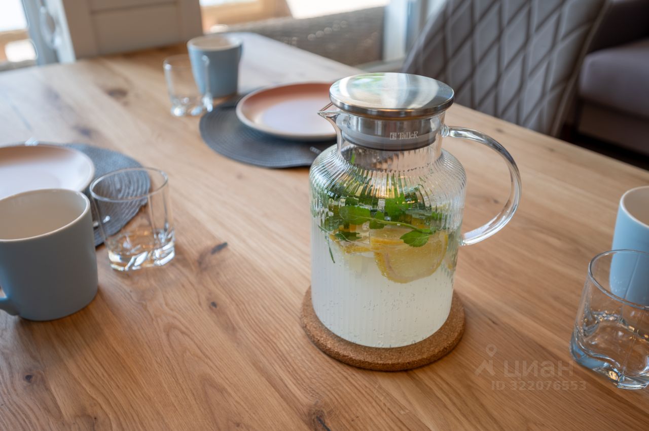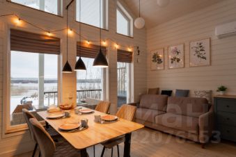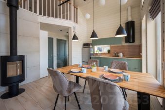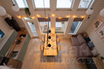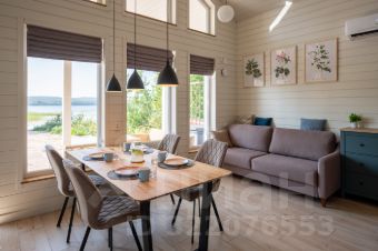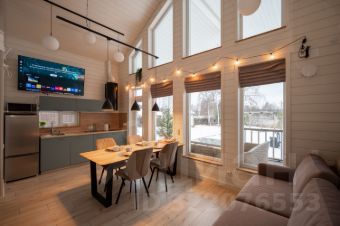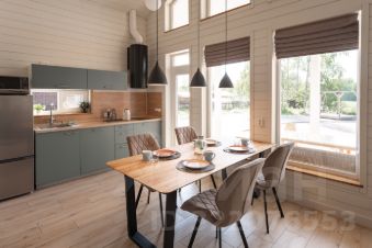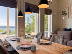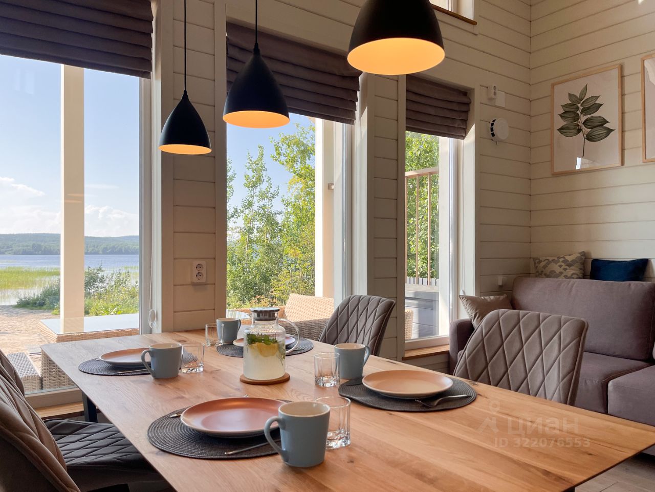- кухня-гостиная с высокими потолками (до 5 м), видом на озеро и большим обеденным столом,