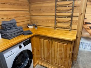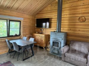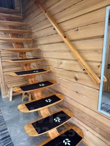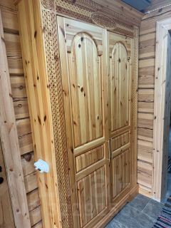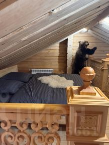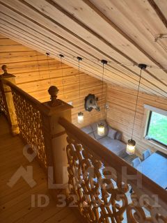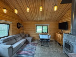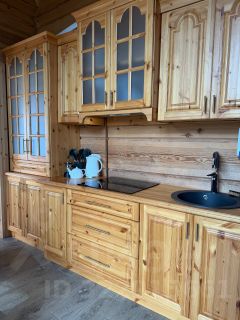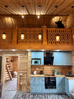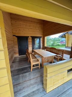 сруб из лафета, камин из талькомагнезита, просторная финская сауна , дизайнерская мебель из массива и множество деталей тонкой ручной работы из натурального дерева.