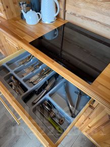 Кухня оборудована большим двухкамерным холодильником, духовым шкафом, плитой, посудомоечной машиной, микроволновой печью и всеми необходимыми мелкими бытовыми приборами, кастрюлями и сковородами для приготовления пищи.