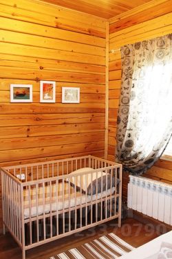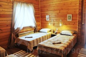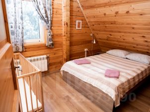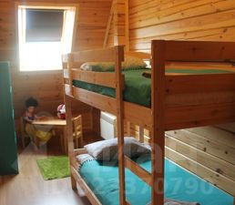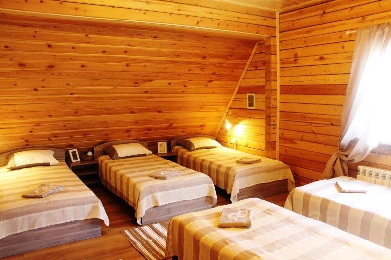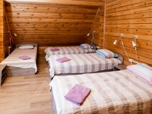 На первом этаже также расположены просторный холл, туалетная комната и сауна, а на втором этаже — спальные комнаты. В первой спальне вы найдете двуспальную кровать для родителей и детскую кроватку для малыша, во второй смогут устроиться сразу пять человек, третья спальня — это детский уголок с двухъярусной кроватью и четвертая спальня предназначена для четверых человек.