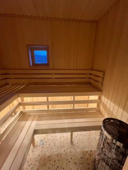 * в доме 3 спальни (2 кровати 160*200, 2 кровати 90*200), 2 двуспальных дивана, кроватка-манеж, раскладушка для детей 150*70, 2 санузла, сауна, во дворе гриль-домик, мангал, стол, детская площадка.