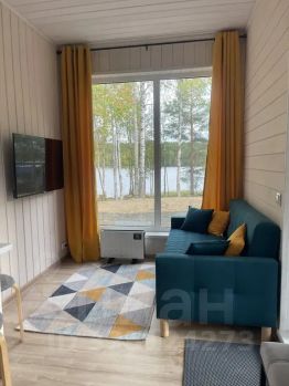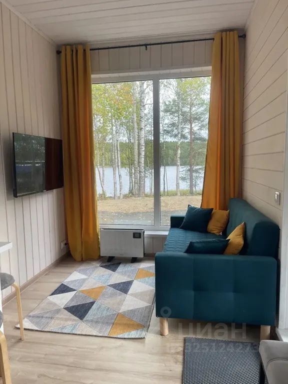 В комнате-студии есть большое панорамное окно с видом на озеро,