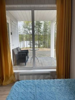 В комнате: двуспальная кровать 140х200, большое панорамное окно, из которого открывается вид на озеро), небольшой стеллаж.
