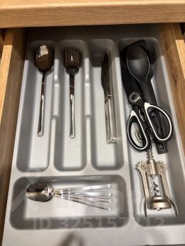 - посуда: тарелки, стаканы, столовые приборы, набор мисок, дуршлаг, кастрюля и сковородка