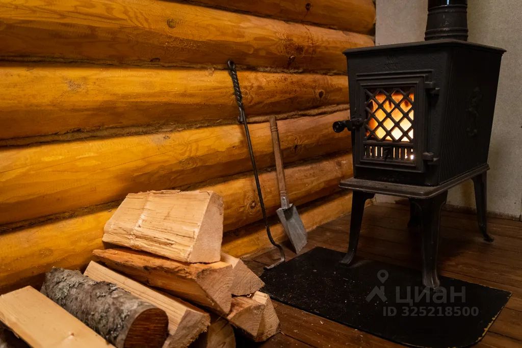 Кухня оборудованная. Есть плита, холодильник, микроволновая печь, базовый набор посуды на 5 персон, питьевая родниковая вода, чайник и все необходимое для комфортного пребывания. Обеденная зона там же. В комнате дровяной камин.