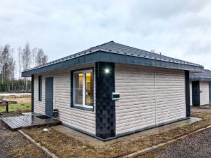 Дом из эко-материалов с панорамным с видом на лес. Вместительность до 4 гостей. Оснащен всем необходимым для комфорта гостей: двуспальный кровать, раскладной диван, комод для хранения, телевизор, бесплатный Wi-Fi, оборудованная кухонная зона, посудомоечная машина, душ, туалет, средства гигиены, теплый пол, собственная терраса с мебелью, мангал.