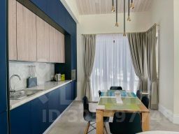 Кухня с обеденной зоной (варочная панель с вытяжкой, кофемашина, посудомоечная машина, СВЧ-печь, холодильник, мойка, электрический чайник, кухонная и столовая посуда, системы хранения, обеденная зона или стол с 6 стульями)