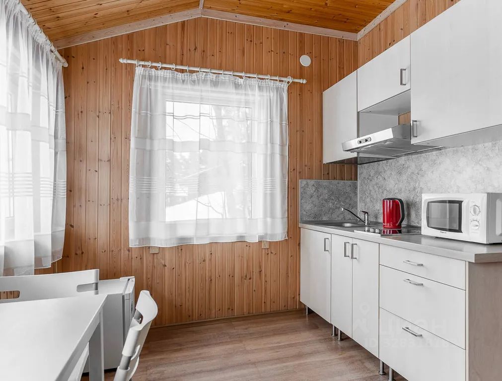 Коттедж состоит из комнаты, отдельной кухни, оборудованной всем необходимым инвентарем (охлаждающий минибар, микроволновая печь, плита, электрочайник, набор посуды).
