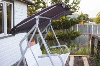 Обустроенный для отдыха большой двор. Во дворе свой песчаный пляж, открытая терраса для отдыха с видом на озеро, детская площадка, качели, батут, беседка, терраса на воде.