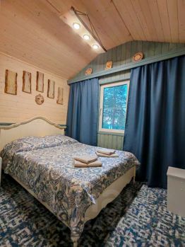 Вместимость коттеджа: 2 человека на основной двуспальной кровати (спальное место 1.4 м х 2 м) + дополнительное место (раздвижное кресло трансформер, спальное место 80 см х 2 м)