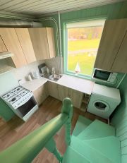Оборудованная кухня с плитой, микроволновой печкой и холодильником.
