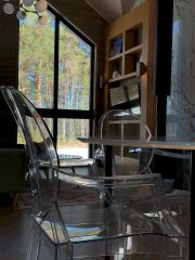 Гостей ждет приглушенный свет, элегантные интерьеры, полное погружение в релакс и премиальный отдых. В распоряжении гостей 120кв. Из них: две просторных спальни, свободная зальная комната с полноценной полностью оборудованной кухней, санузел со всеми удобствами и косметикой. Панорамное остекление в каждом доме.