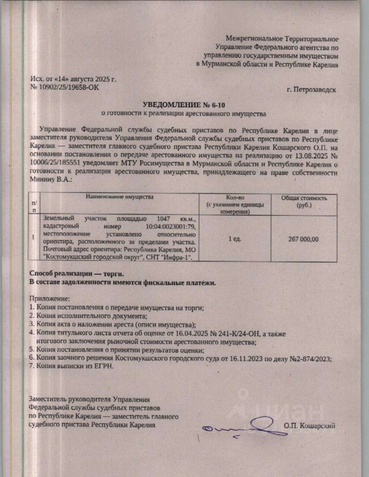 Лот 2. Земельный участок с кадастровым номером: 10:04:0023001:79, площадь 1047 кв. м. Местоположение установлено относительно ориентира, расположенного за пределами участка. Почтовый адрес ориентира: Республика Карелия, МО "Костомукшский городской округ", СНТ "Инфра-1". Категория земель — земли сельскохозяйственного назначения. Вид размешенного использования — для ведения садоводства. Вид права — собственность.