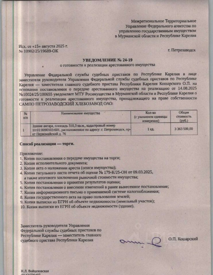 Лот 4. Здание ангара, КН - 10:01:0090103:601, площадью 310, 3 кв. м. , расположенное по адресу: Республика Карелия, г. Петрозаводск, пр-кт. Первомайский, д. 76. Вид права собственность.