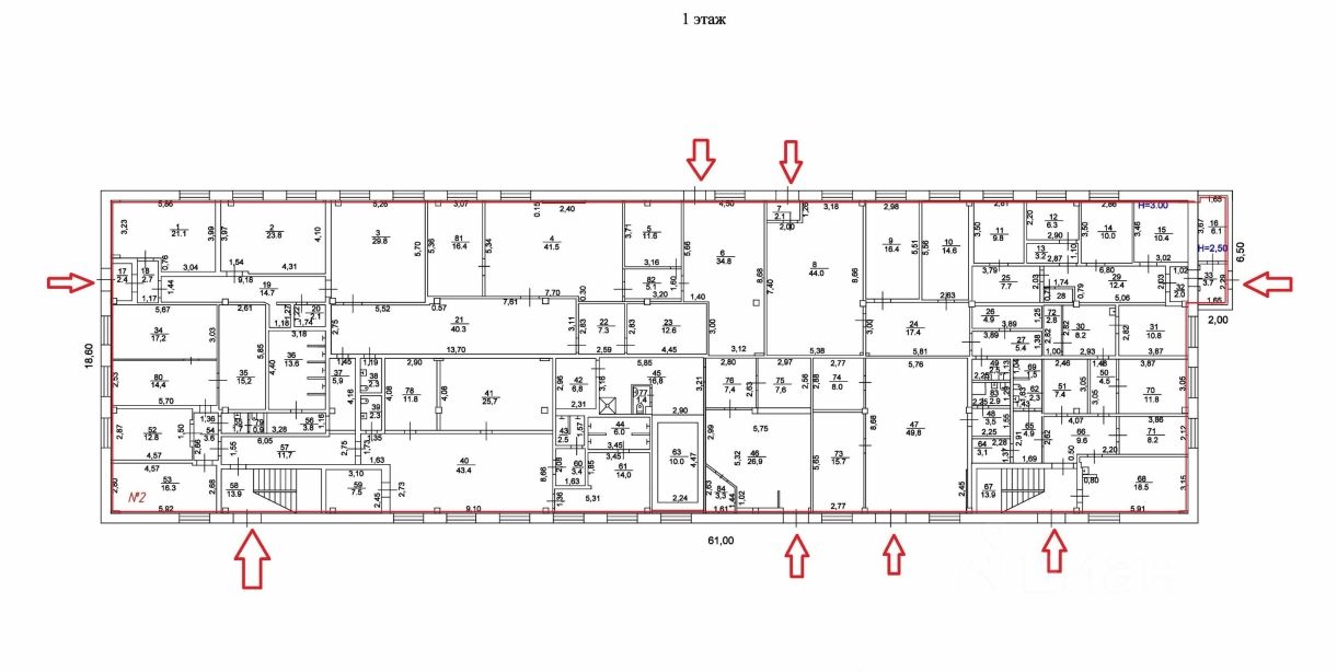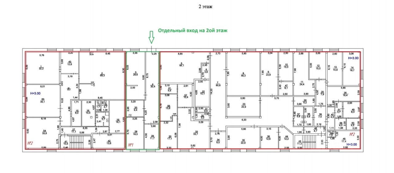 Помещение 2 расположено на 1 и 2 этажах. Имеется несколько отдельных входов в помещение.