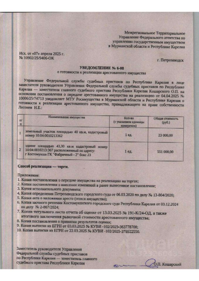 Лот 4. Здание площадью 43, 3 кв. м. , кадастровый номер 10:04:0010213:367, расположенный по адресу: г. Костомукша, ГК "Фабричный-2", бокс 23. Количество этажей 2, количество подземных этажей 1. Земельный участок площадью 40, 0 кв. м. , кадастровый номер 10:04:0010213:362.
