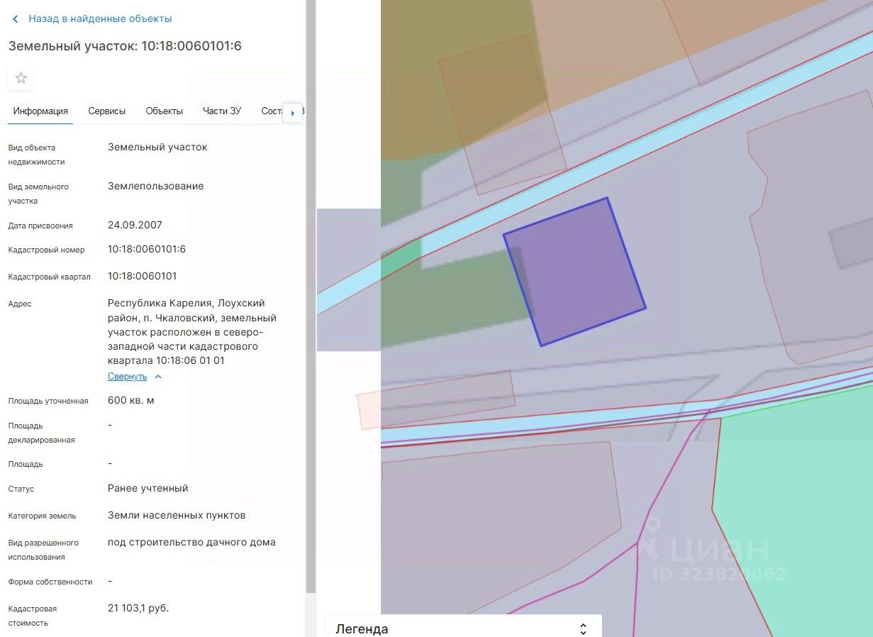 Продажа земельного участка из земель населенных пунктов, имеющего кадастровый номер 10:18:0060101:6, площадью 600 кв.м, местоположение: Республика Карелия, Лоухский район, п. Чкаловский, земельный участок расположен в северо-западной части кадастрового квартала 10:18:06 01 01, вид разрешенного использования "под строительство дачного дома".
