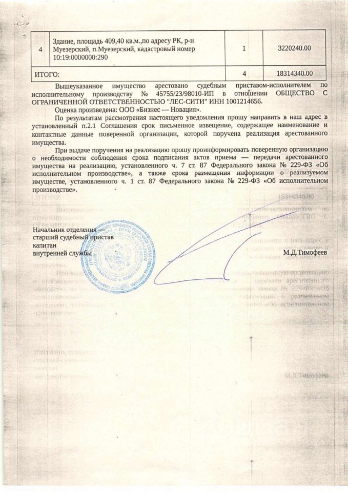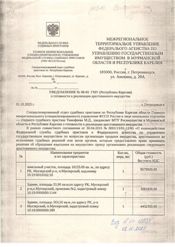 Земельный участок, площадью 16155,0 кв.м., КН 10:19:0010102:10, расположенный по адресу: Республика Карелия, р-н Муезерский, п. Муезерский. Категории земель земли населенных пунктов, вид разрешенного пользования - для эксплуатации гаража.Нежилое здание, площадью 55,9 кв.м., КН 10:19:0000000:1144. Нежилое здание, площадью 563,5 кв.м., КН 10:19:0000000:289,Нежилое здание, площадью 409,4 кв.м., КН 10:19:0000000:290. Вид права - собственность.