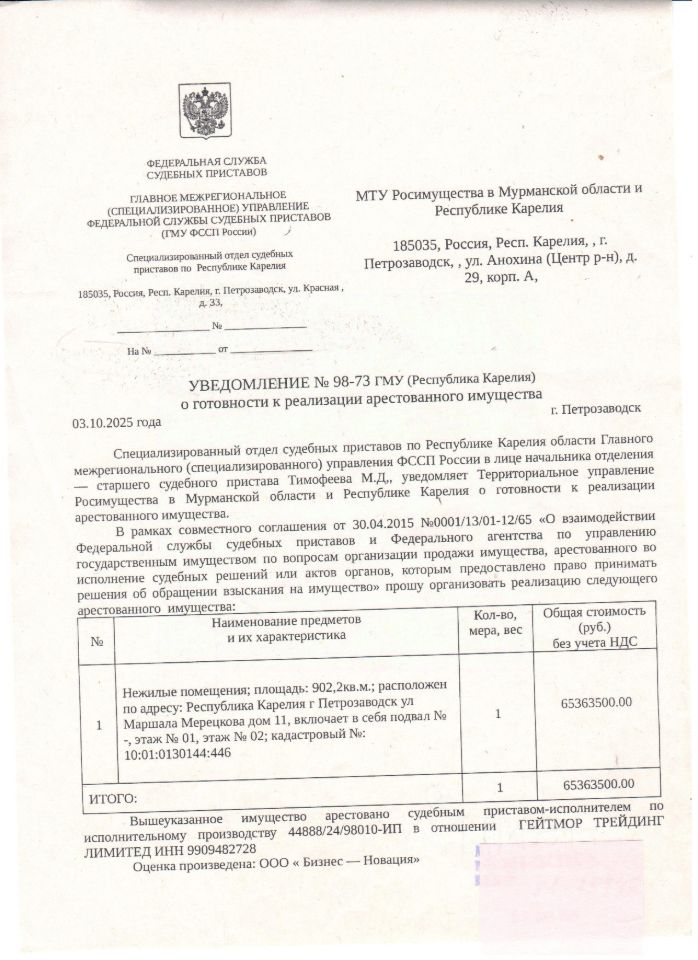 Нежилые помещения, площадью 902,2 кв.м., расположенные по адресу: РК, г. Петрозаводск, ул. Маршала Мерецкова, д. 11, включает в себя подвал, этаж 01, этаж 02, КН 10:01:0130144:446.