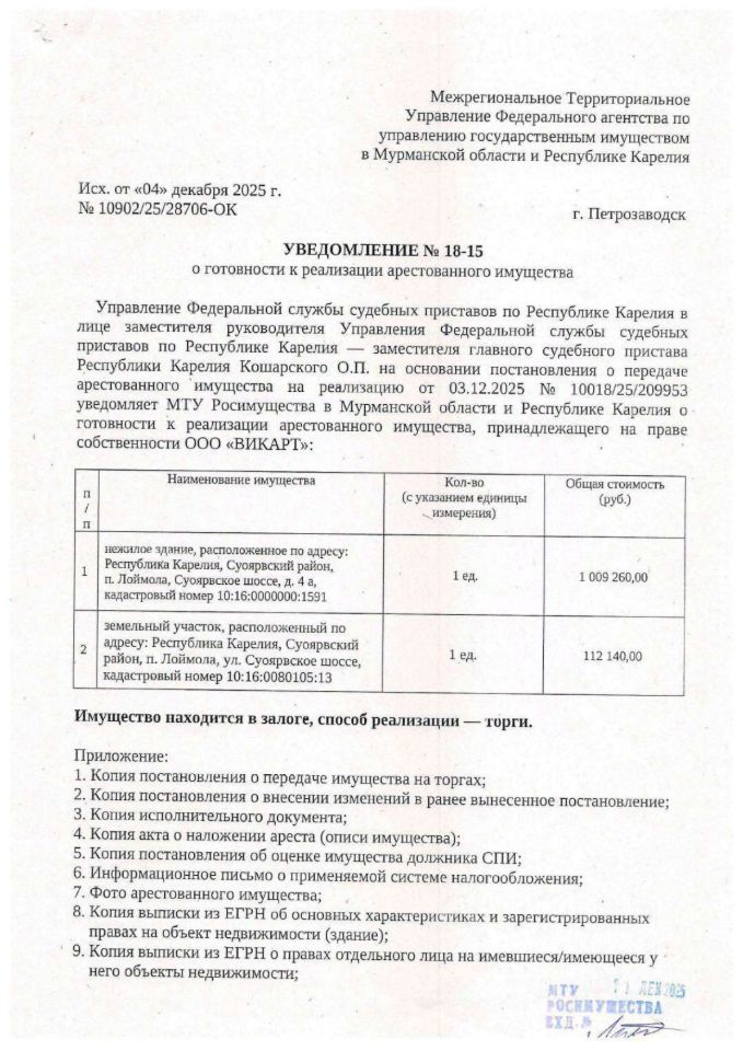Нежилое здание площадью 57,2 кв.м., КН 10:16:0000000:1591, расположенное по адресу: РК, Суоярвский район, п. Лоймола, Суоярвское шоссе, д. 4а. Год завершения строительства 2005. Вид права собственность. Земельный участок площадью 100,0 кв.м., расположенный по адресу: РК, Суоярвский район, п. Лоймола, Суоярвское шоссе, КН 10:16:0080105:13, категория земель: земли населенных пунктов, вид разрешенного использования для строительства здания магазина, Вид права собственность.